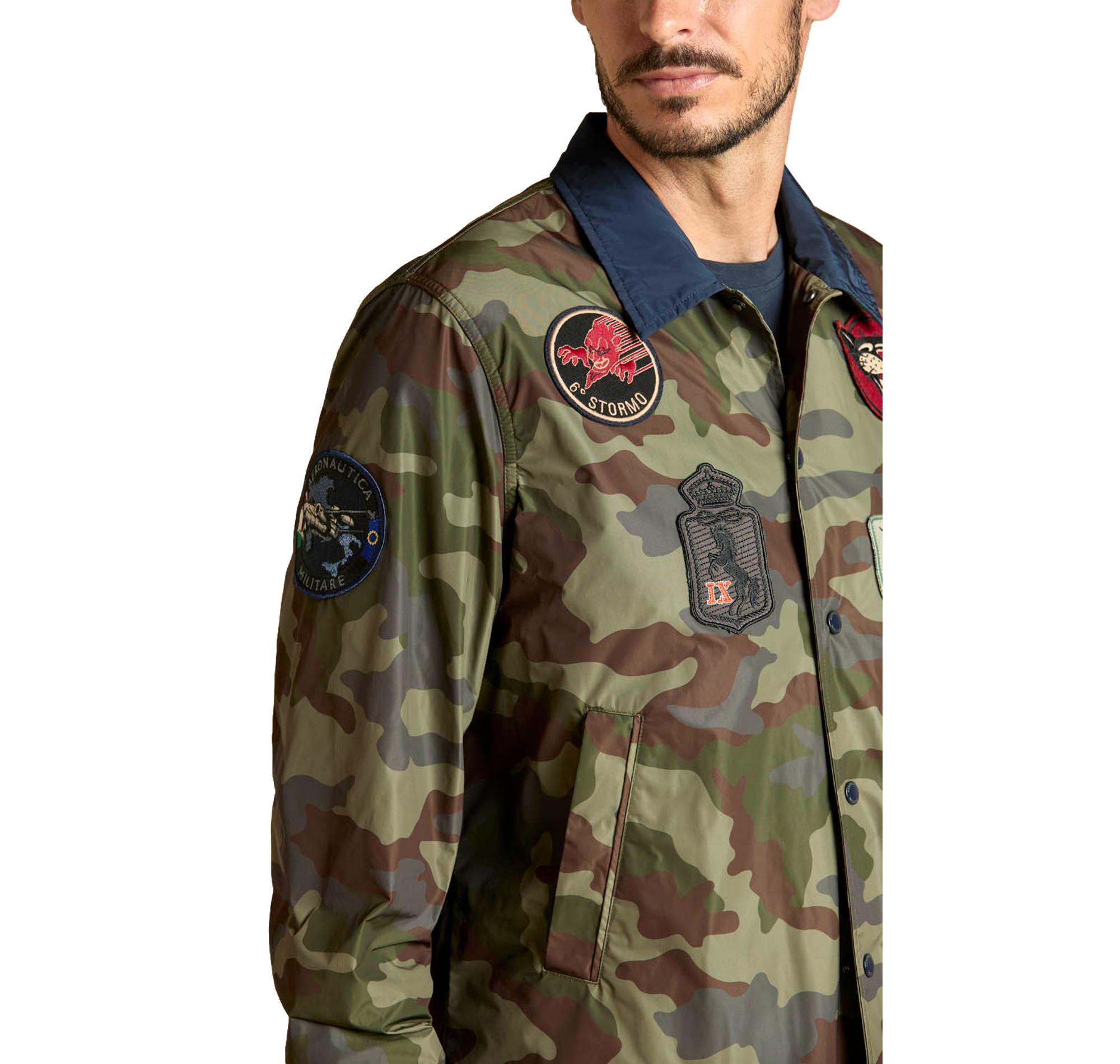 Realizzata in tessuto tecnico waterproof con stampa camouflage verde, questa coach jacket combina funzionalità e stile militare contemporaneo. Le patch ricamate su corpo e maniche raccontano storie di reparti e missioni, rendendo il capo iconico e distintivo.