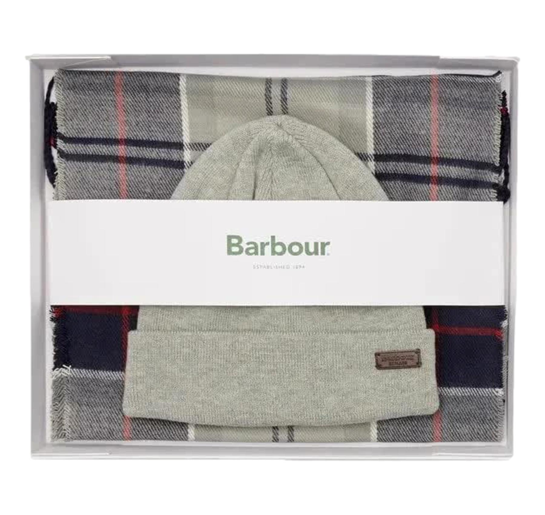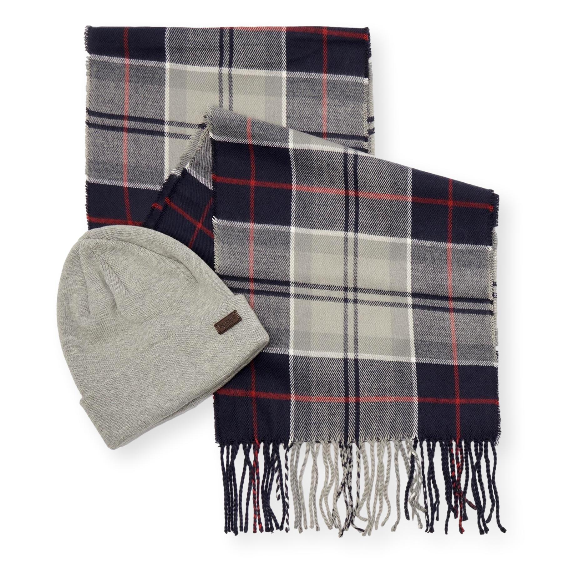Il set include una sciarpa con tradizionale motivo tartan, arricchita da frange decorative, e un berretto in maglia a coste sottili, caratterizzato dal logo Barbour sul risvolto.