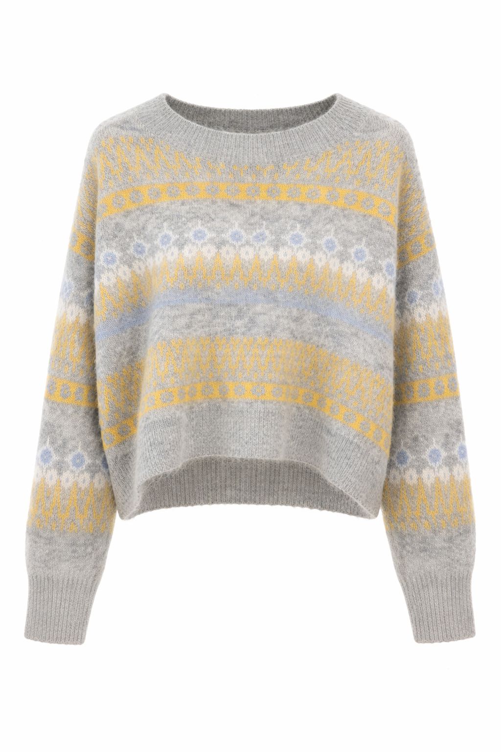 Maglione da donna a girocollo, realizzato in un pregiato misto lana, con una raffinata fantasia che aggiunge un tocco di stile unico. Il tessuto caldo e avvolgente lo rende un capo perfetto per affrontare le giornate più fredde, garantendo comfort e eleganza. Ideale per chi cerca un look casual ma ricercato, adatto a diverse occasioni.