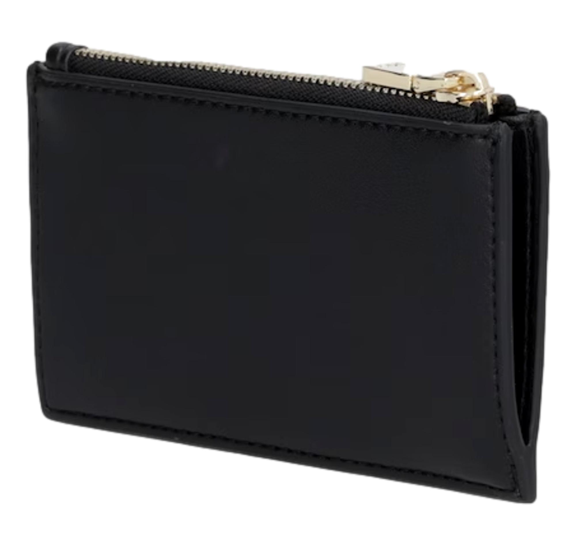 Il logo metallico dorato sulla patta frontale aggiunge un tocco distintivo e luminoso, simbolo di eleganza contemporanea. Dotato di quattro scomparti per carte e di una tasca superiore con chiusura a zip, offre tutto lo spazio necessario per carte, documenti e monete, mantenendo una silhouette sottile e raffinata.