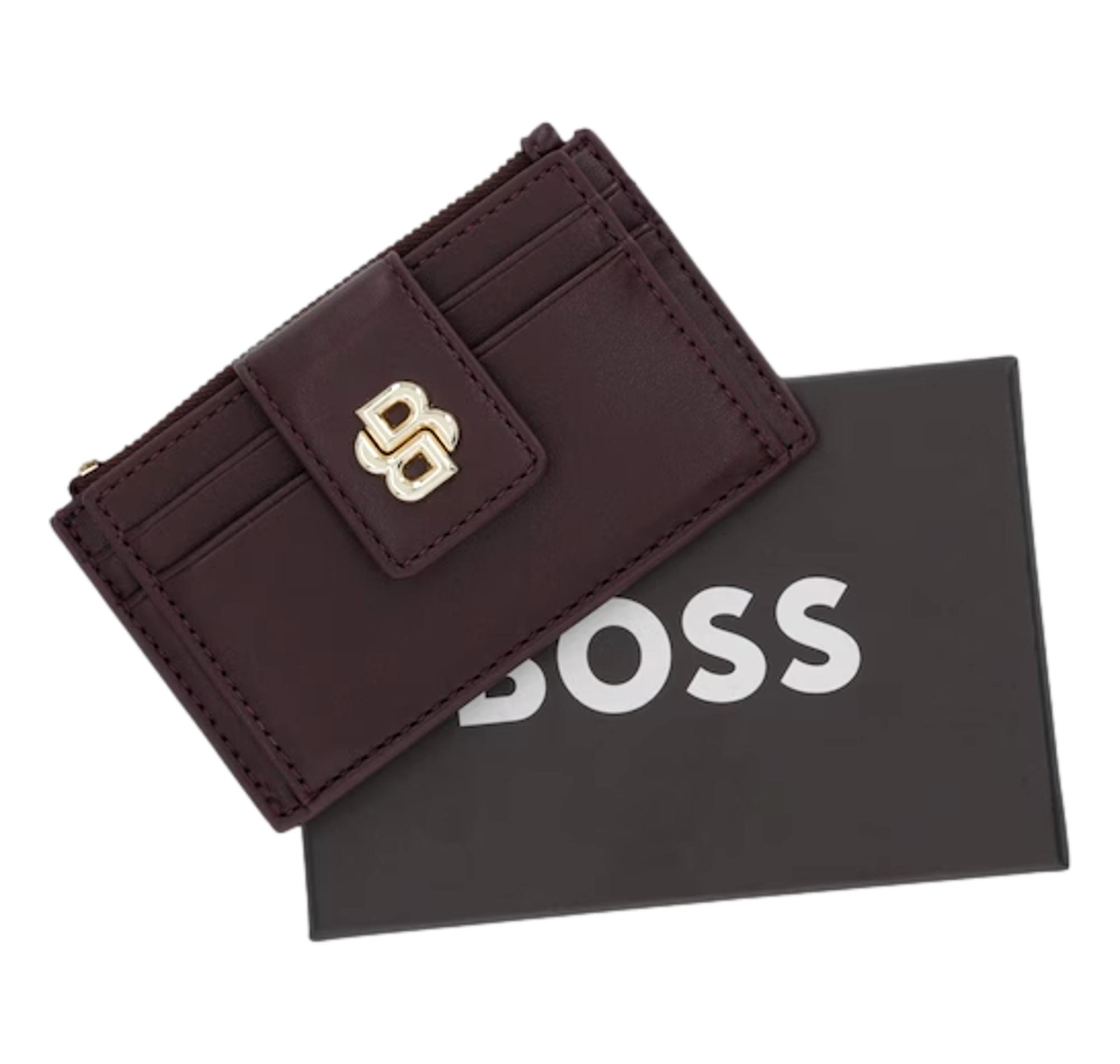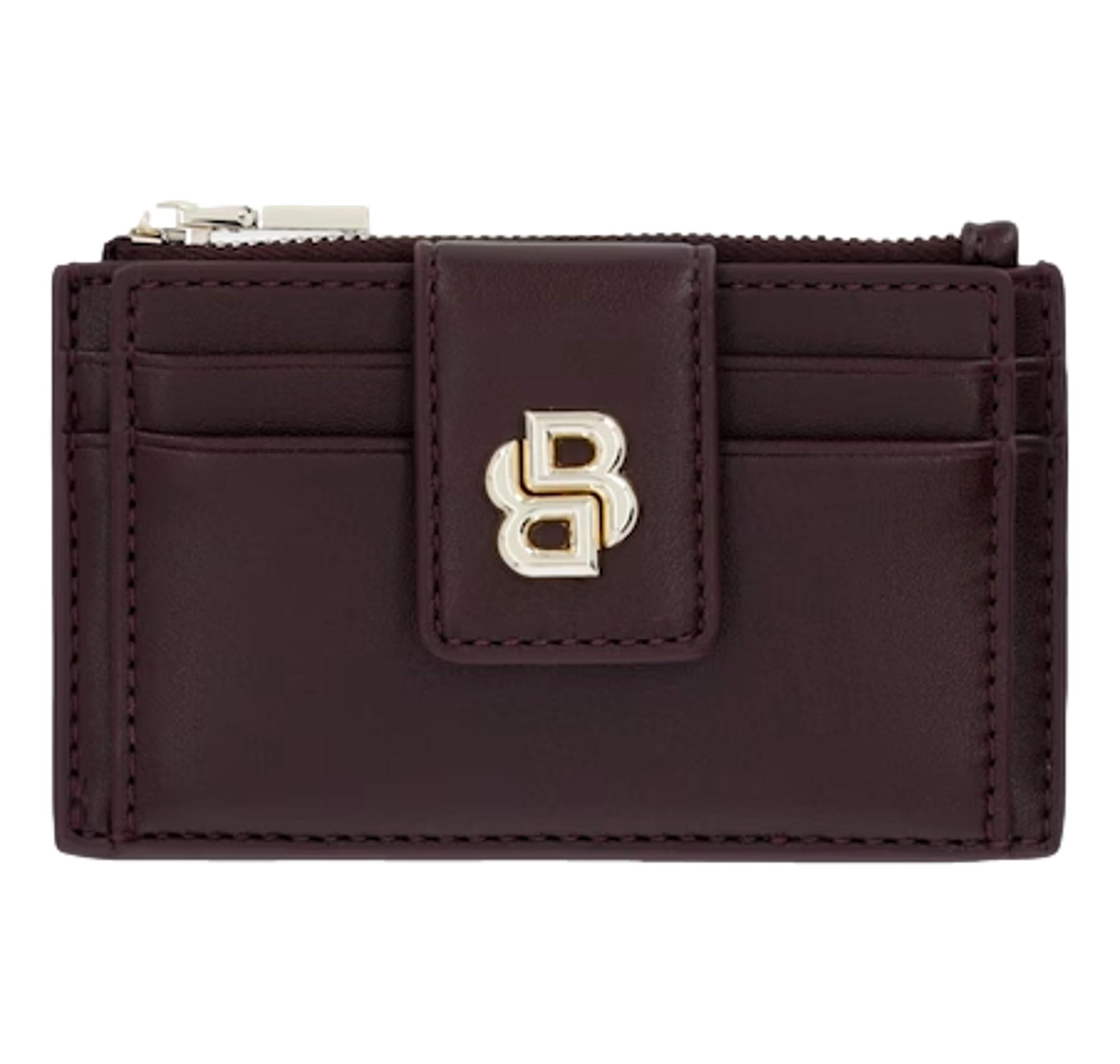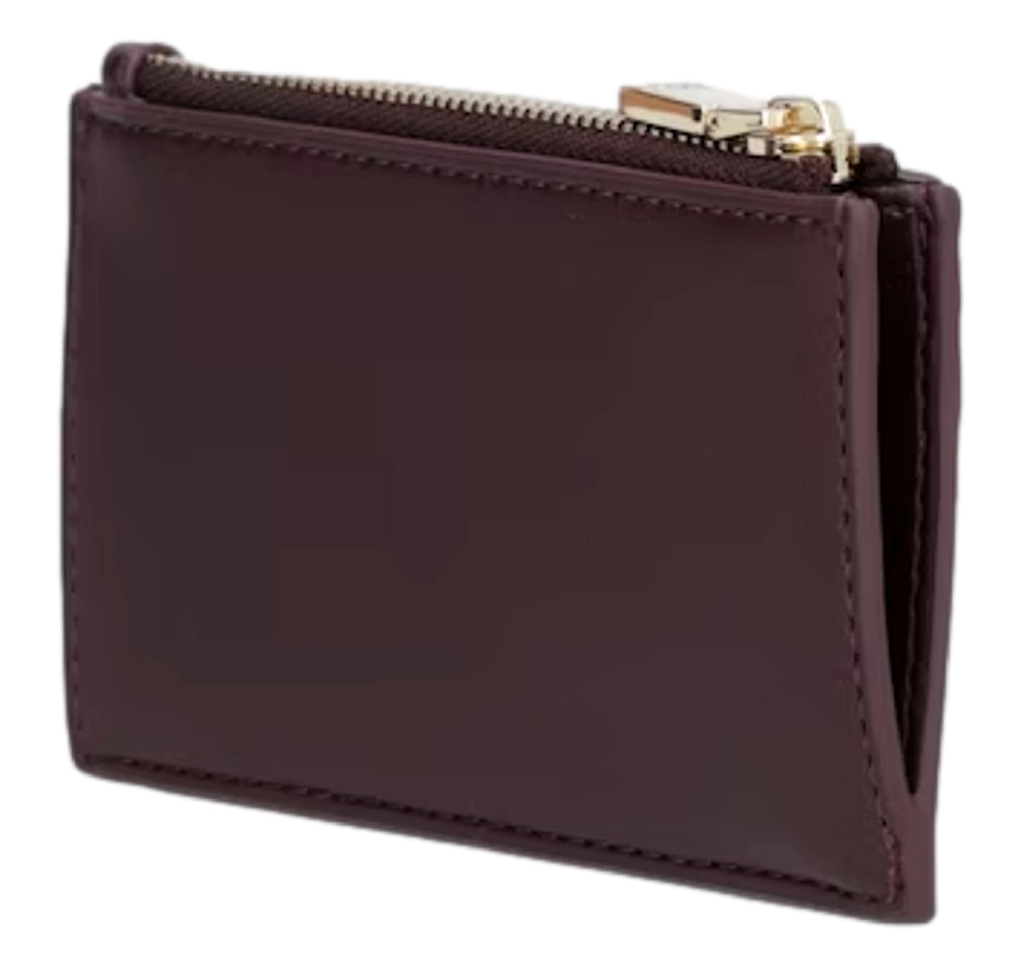 Il logo metallico dorato sulla patta frontale aggiunge un tocco distintivo e luminoso, simbolo di eleganza contemporanea. Dotato di quattro scomparti per carte e di una tasca superiore con chiusura a zip, offre tutto lo spazio necessario per carte, documenti e monete, mantenendo una silhouette sottile e raffinata.