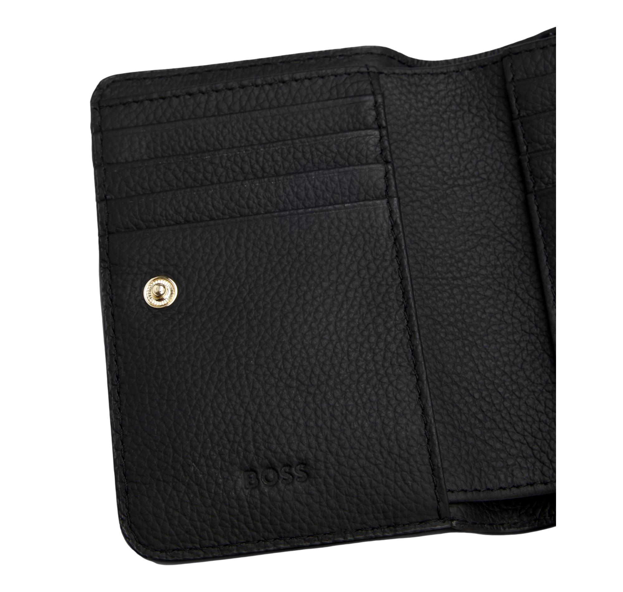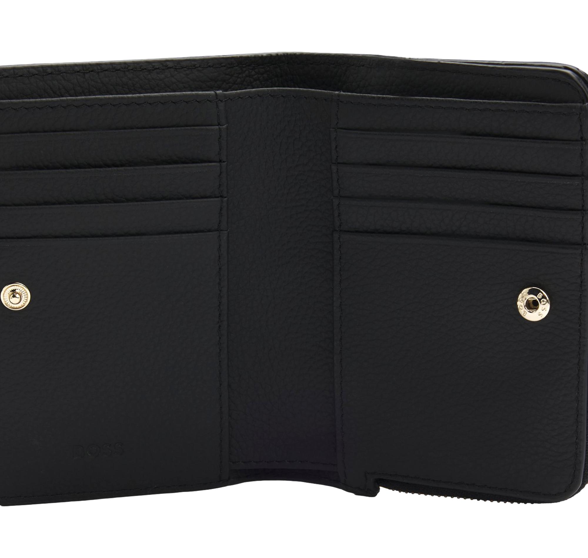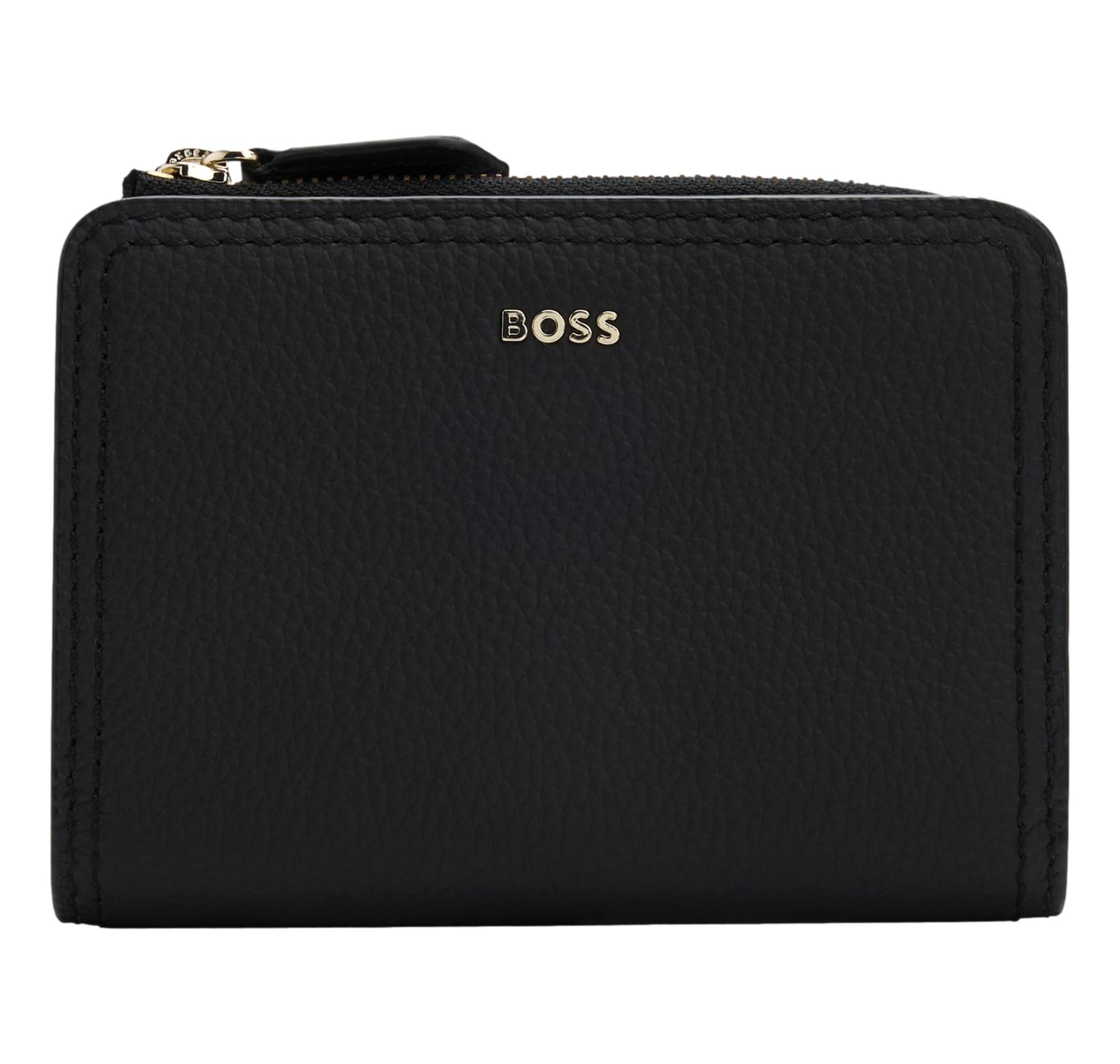 Elegante portafoglio BOSS modello Lenah Small Wallet, realizzato in pelle martellata di alta qualità con scritta dorata sul davanti. Chiusura con zip e logo interno goffrato. Completamente foderato e dotato di scomparti funzionali per carte di credito, banconote e una tasca interna con zip. Un accessorio raffinato e pratico, ideale per ogni occasione.