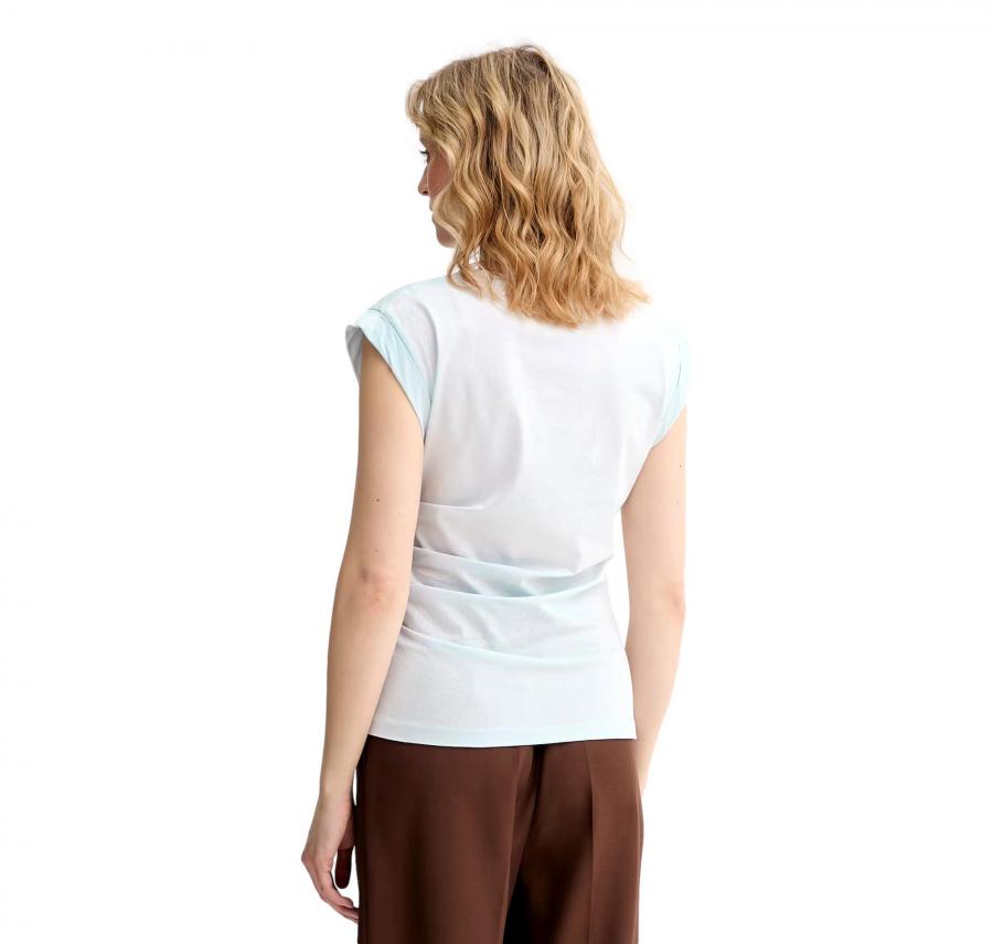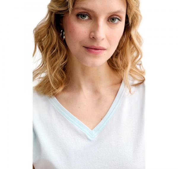 Il collo a V e le maniche corte dal taglio morbido aggiungono un tocco moderno e delicatamente elegante, mentre il colore azzurro chiaro dona luminosità al capo rendendolo facile da abbinare con jeans, pantaloni sartoriali o gonne.