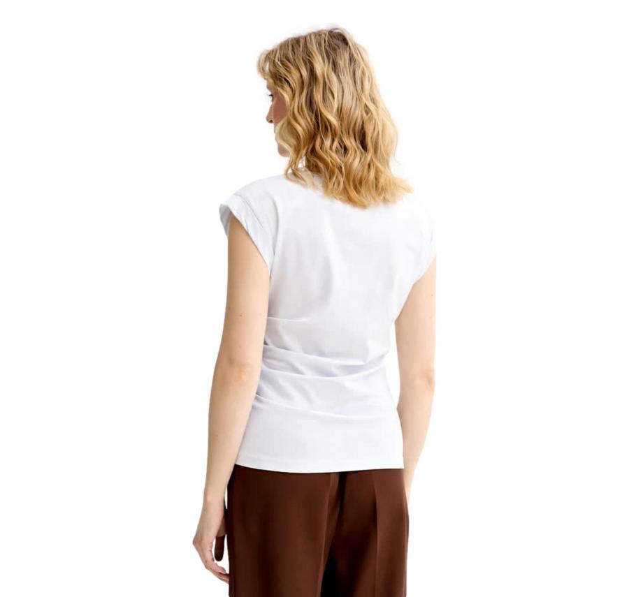 Realizzata in morbido cotone naturale, offre una sensazione di comfort e leggerezza sulla pelle, garantendo traspirabilità e libertà di movimento durante tutta la giornata. La linea pulita e femminile valorizza la silhouette mantenendo una vestibilità comoda e raffinata.