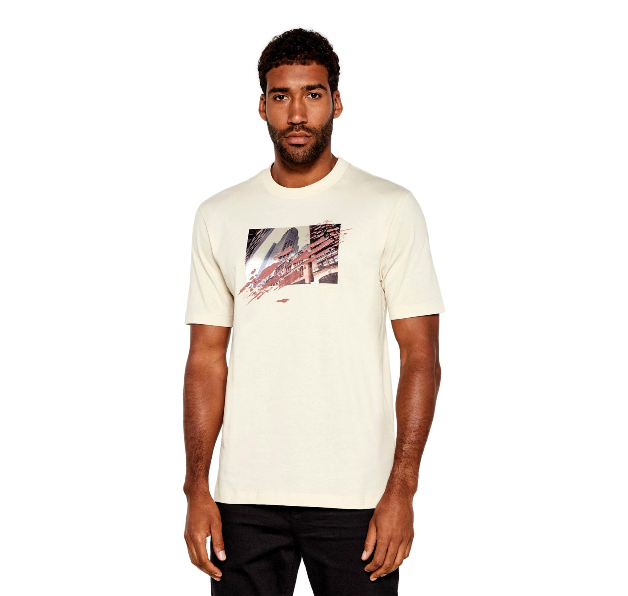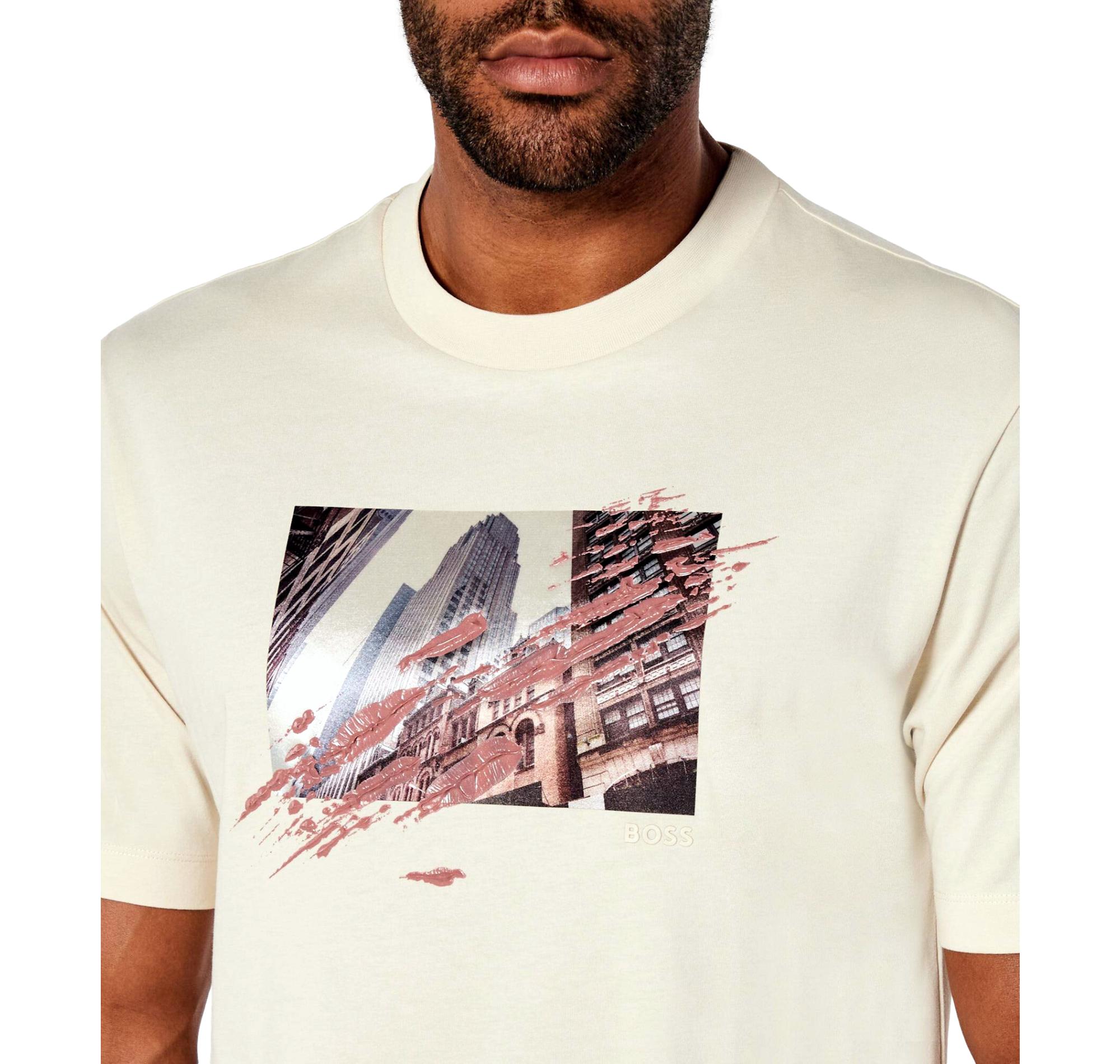 T-shirt in cotone firmata BOSS effetto 3D,con stampa frontale raffigurante un paesaggio urbano moderno.