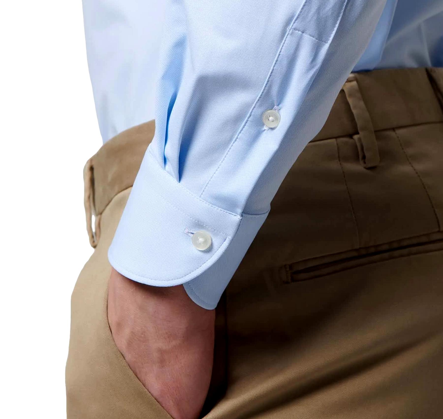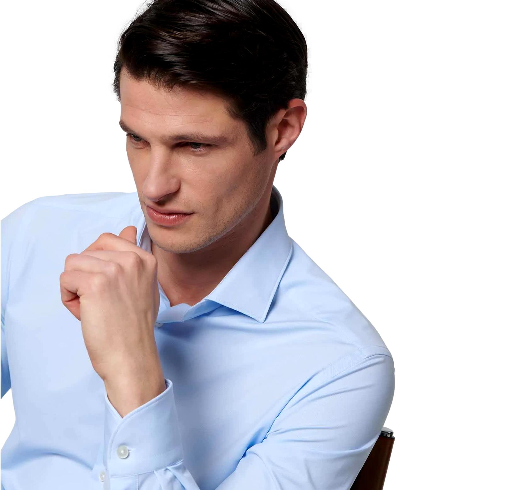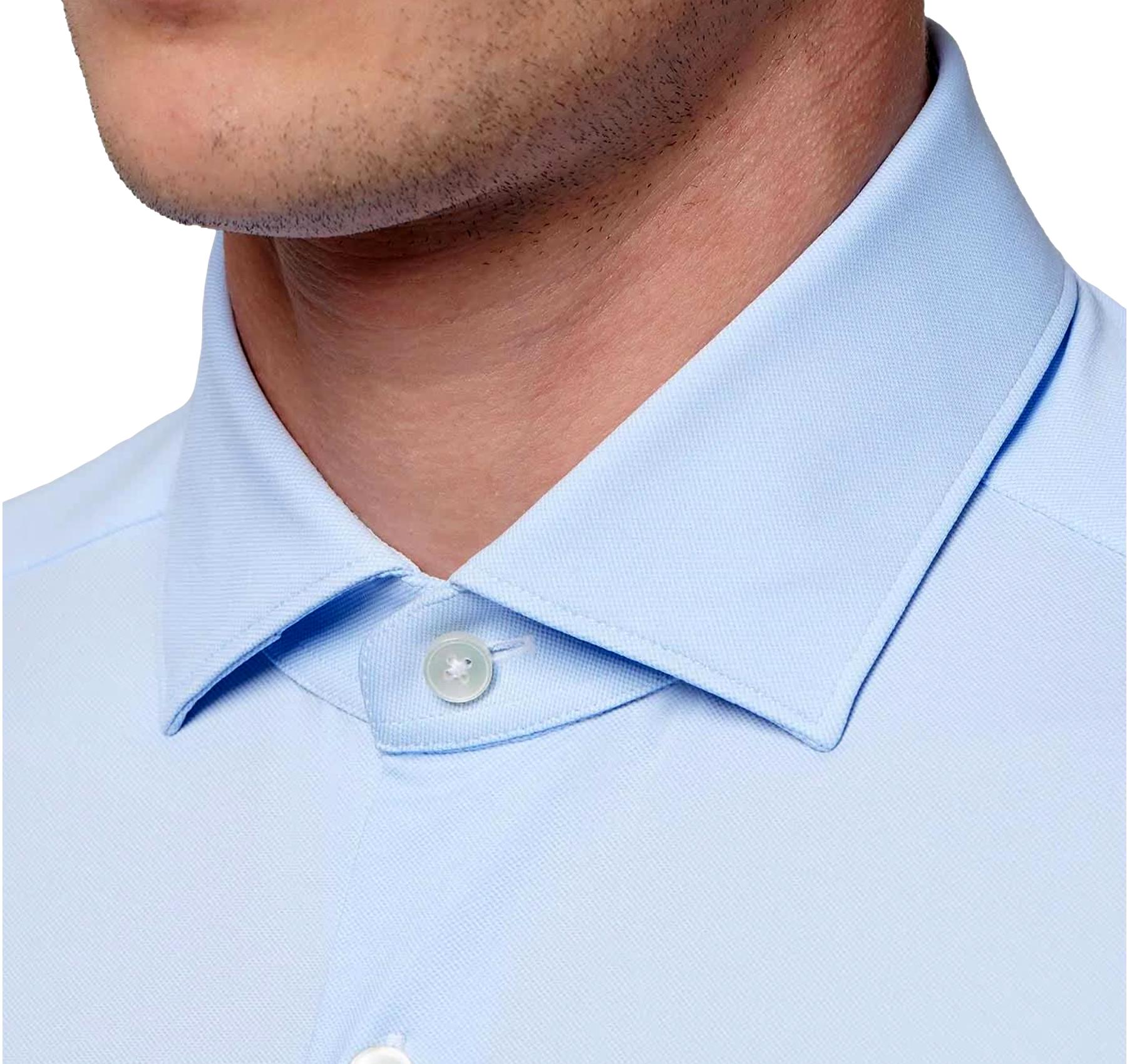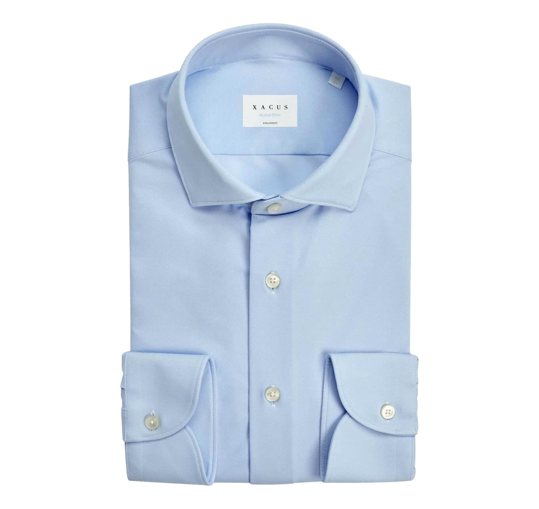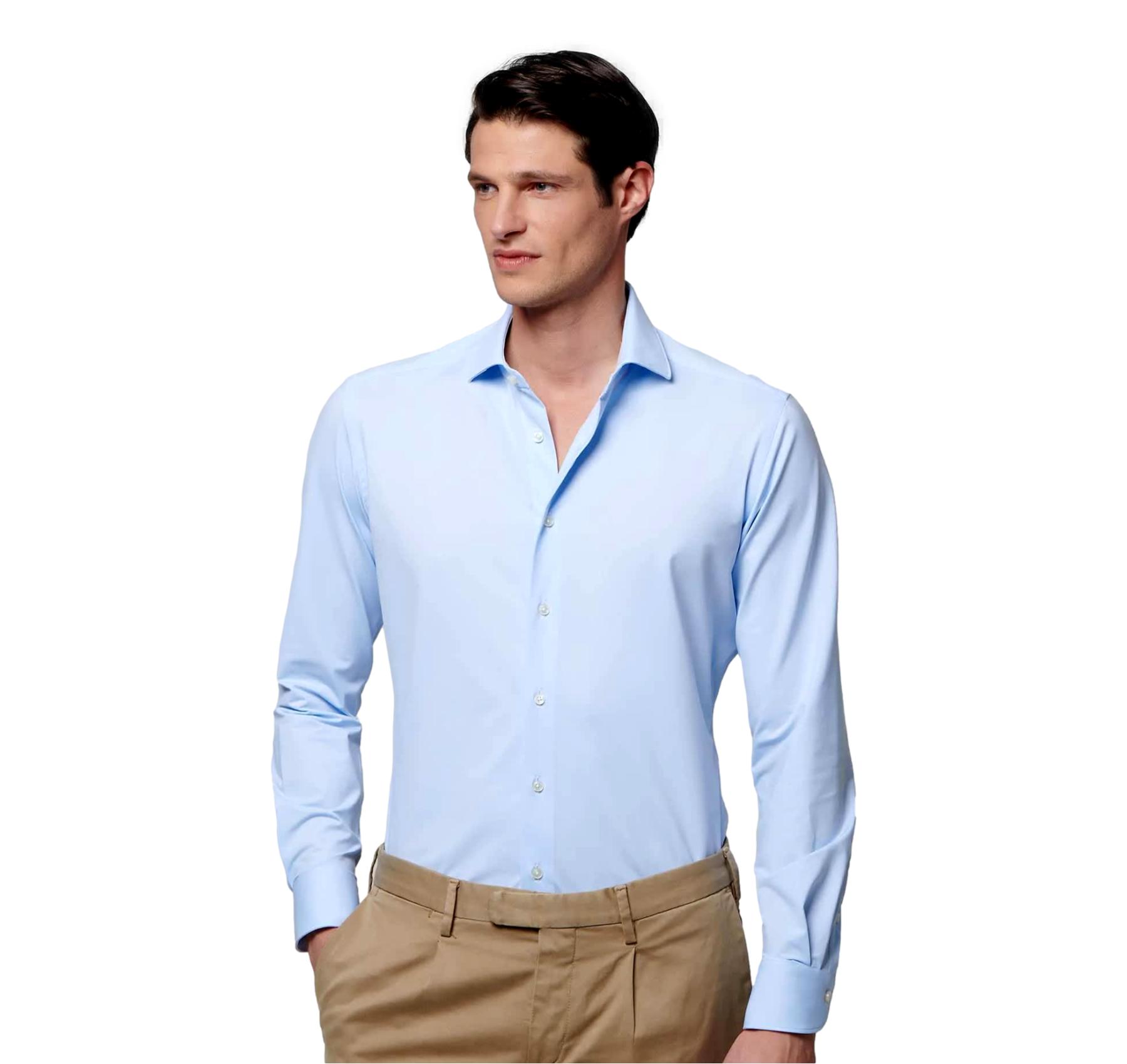 Camicia da uomo con collo francese piccolo, rivisitato nelle proporzioni per un look moderno ed elegante. Questo modello Evolution Classic Fit Active, proposto in raffinato celeste chiaro, unisce estetica formale e innovazione tecnica, risultando ideale per un utilizzo quotidiano dinamico. La vestibilità slim fit valorizza la silhouette con volumi asciutti, garantendo al tempo stesso comfort e libertà di movimento. Rifinita con ribattuta ad un ago con 7 punti per centimetro, mosche sul fondo, stecche estraibili e bottoni con gambo in filo di seta termosaldato, rappresenta una scelta essenziale per il guardaroba maschile contemporaneo, perfetta per ogni occasione d’uso.