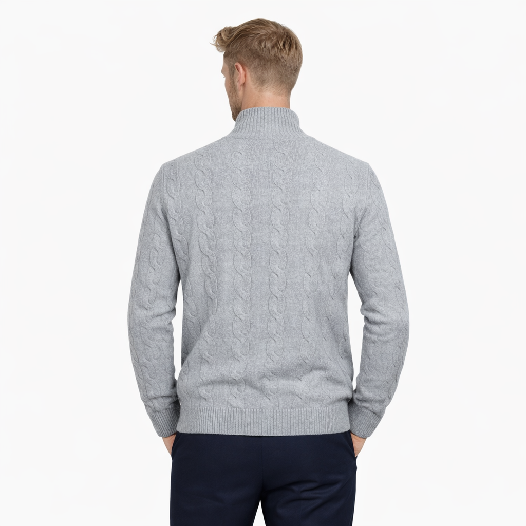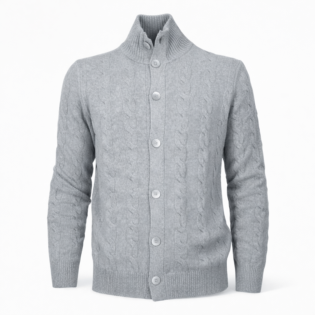 Elegante e raffinato, questo cardigan uomo CASHMERE COMPANY grigio lavorato a treccia rappresenta un capo intramontabile del guardaroba maschile.