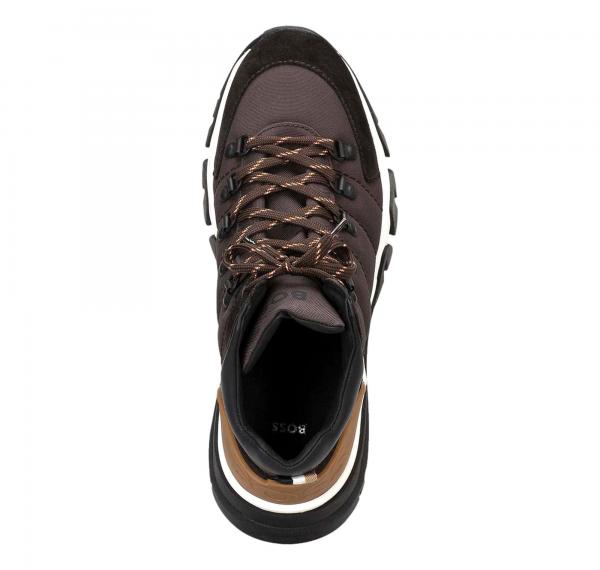Stivaletti di tendenza BOSS. Realizzati in nappa, gomma, pelle scamosciata e tessuto lavorato, questi stivaletti ibridi presentano allacciatura e suola ispirate all'escursionismo. Il tallone è rifinito con un logo BOSS e un tirante con le righe tipiche del marchio.