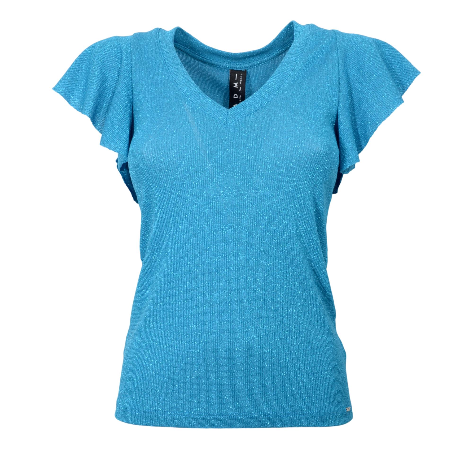 T-shirt scollo a V in tessuto lurex e con maniche volant
