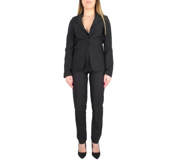 Caratteristiche: Giacca monopetto con reverse classico e tasche a scomparsa anteriori. Pantaloni a sigaretta a vita alta