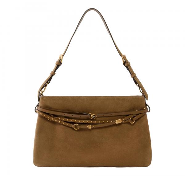 Realizzata in morbida pelle scamosciata, questa borsa combina materiali pregiati e dettagli ricercati per un look distintivo e raffinato. Il design è impreziosito da una sottile cintura coordinata regolabile che avvolge la parte superiore con più giri, decorata con borchie arrotondate, piccola fibbia circolare con gli iconici Love Birds e anelli metallici che formano il logo lettering PINKO.