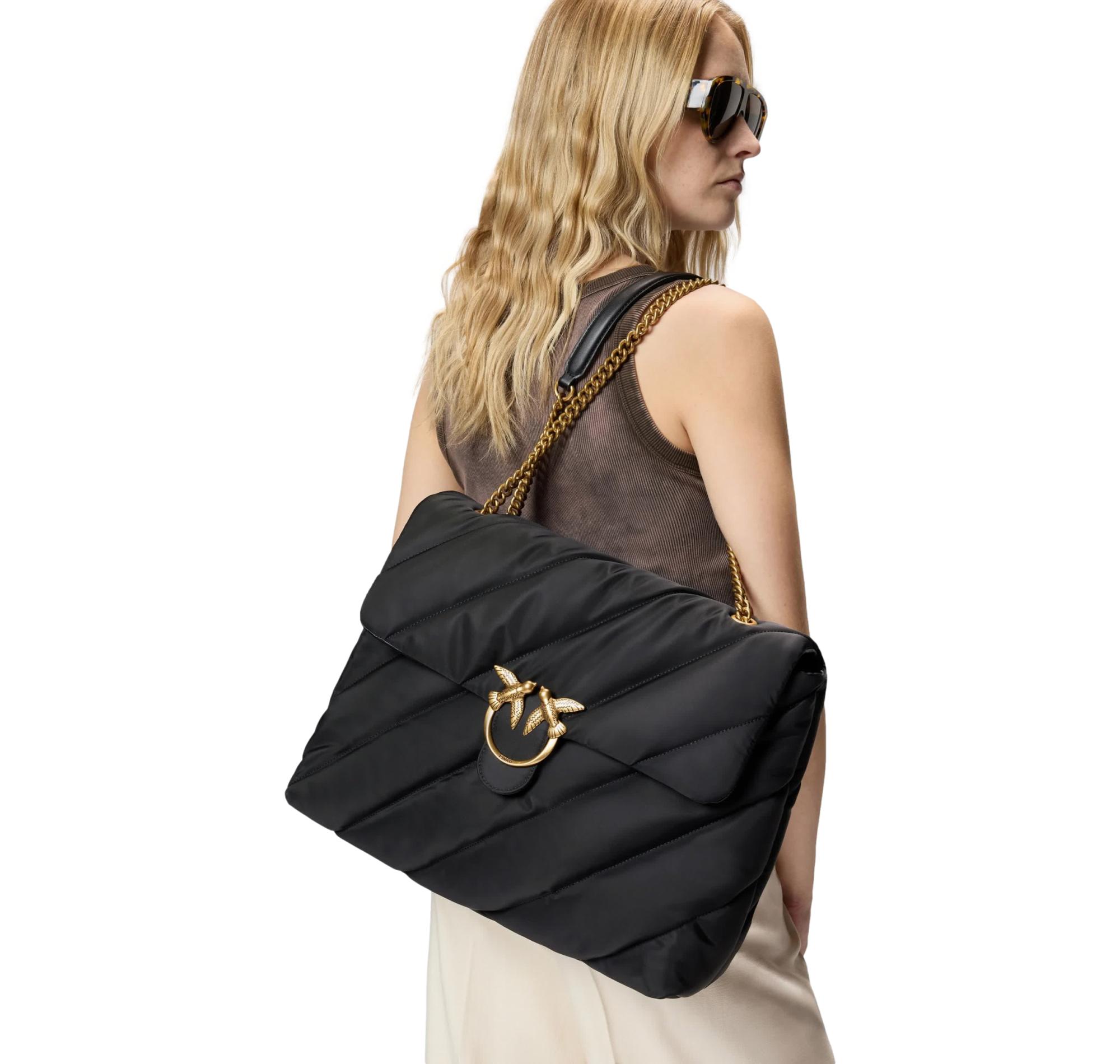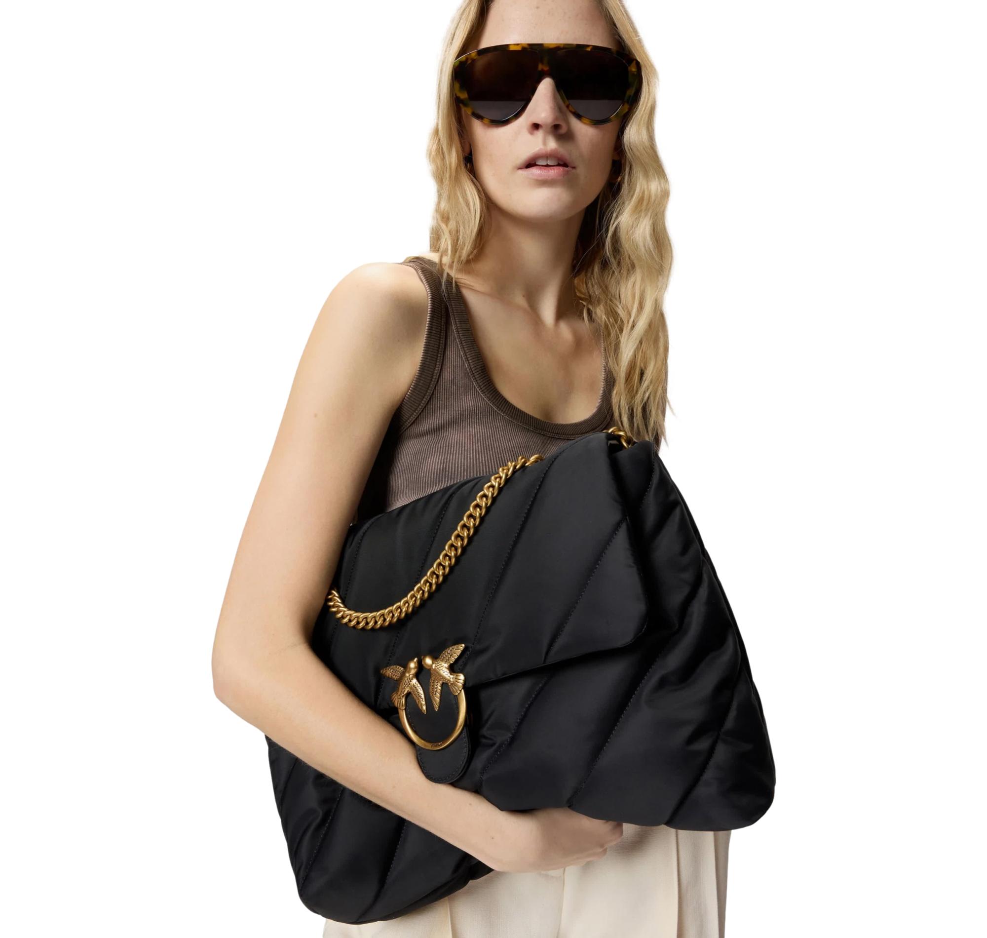 La PINKO Love Bag Puff grande è un accessorio contemporaneo ed elegante, caratterizzato da una silhouette leggermente trapezoidale e da un design piatto che esalta lo stile moderno del brand.