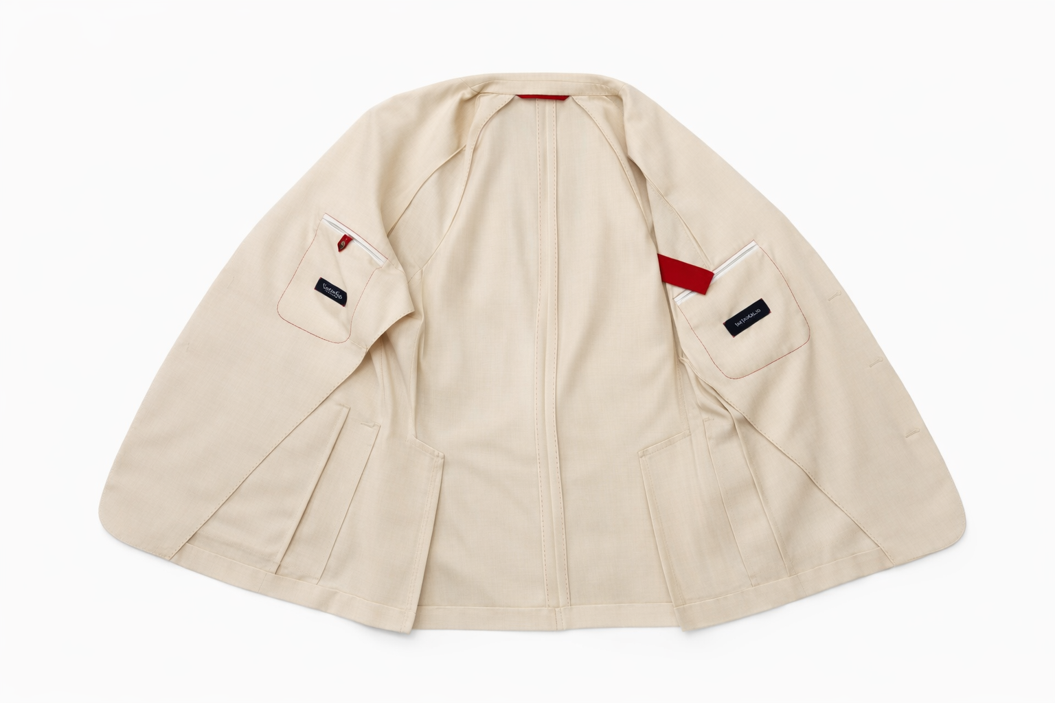 Il colore sabbia raffinato dona freschezza e distinzione, mentre la struttura giacca sfoderata garantisce leggerezza e comfort anche nelle stagioni più calde.