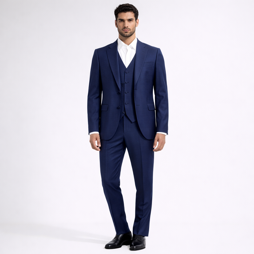 Il completo è composto da giacca, gilet e pantalone coordinati in una raffinata tonalità blu. La giacca monopetto a due bottoni presenta revers con fantasia coordinata al gilet, dettaglio distintivo che dona carattere e personalità al capo. I due spacchi laterali garantiscono comfort e libertà di movimento.