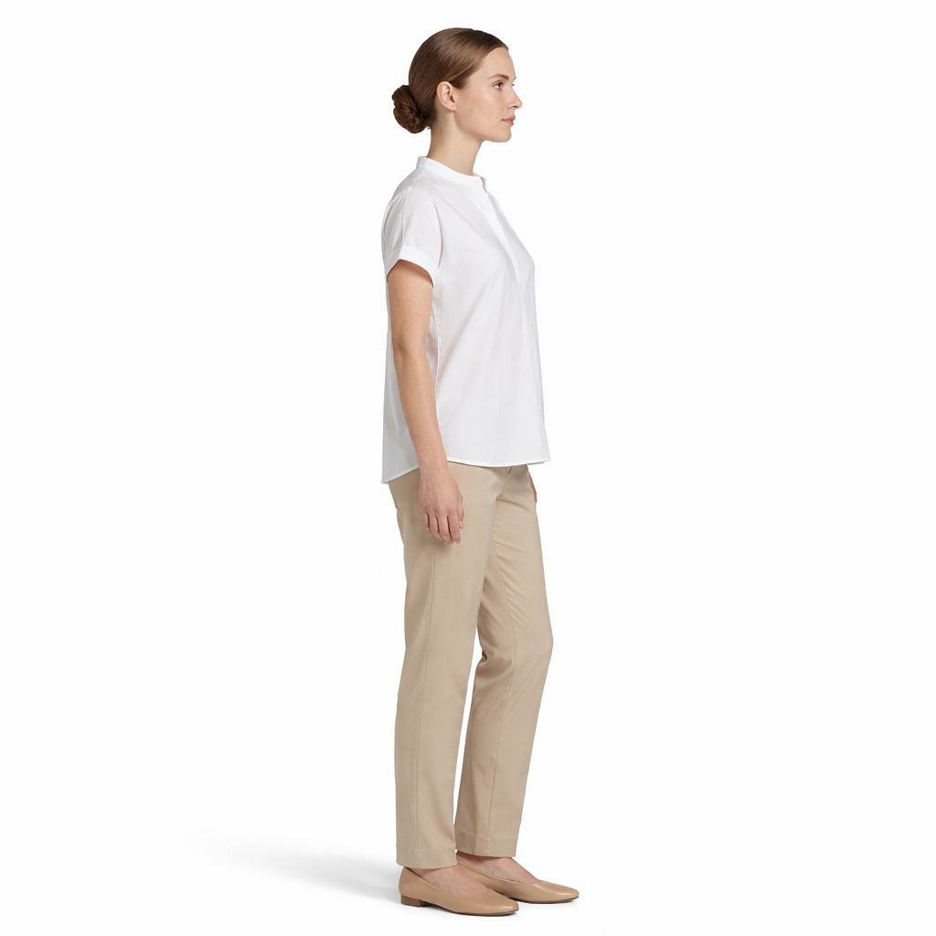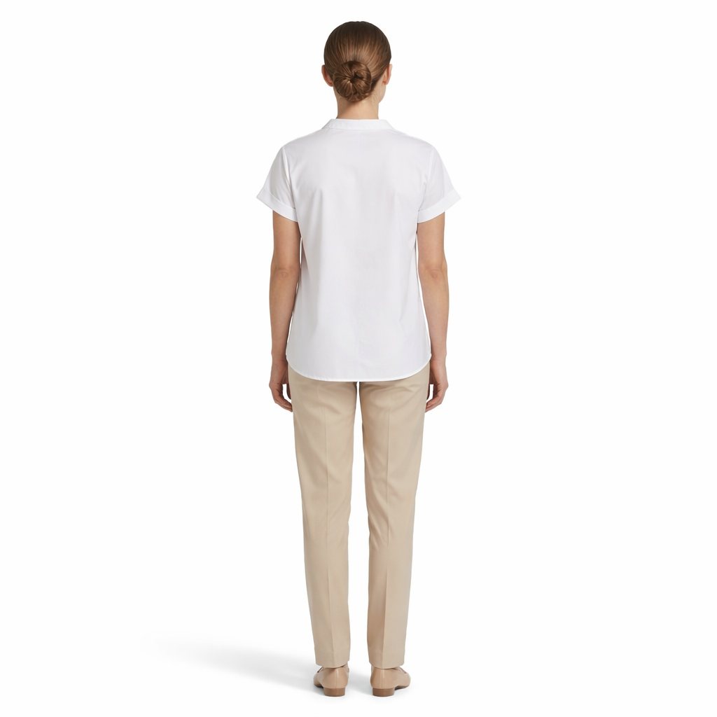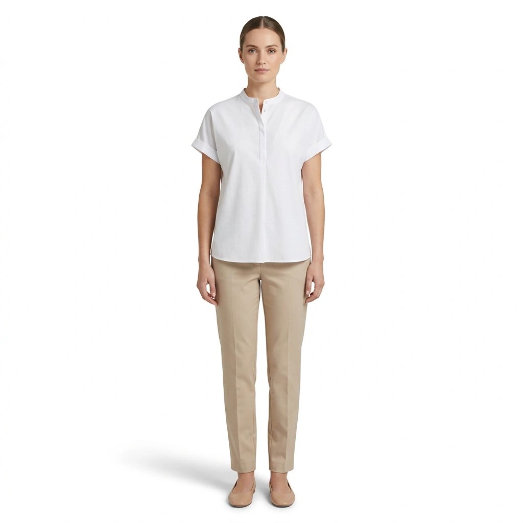 Caratteristiche: Camicia serafino con bottoni coperti, spalle cadute,maniche corte e ampie con risvoltino